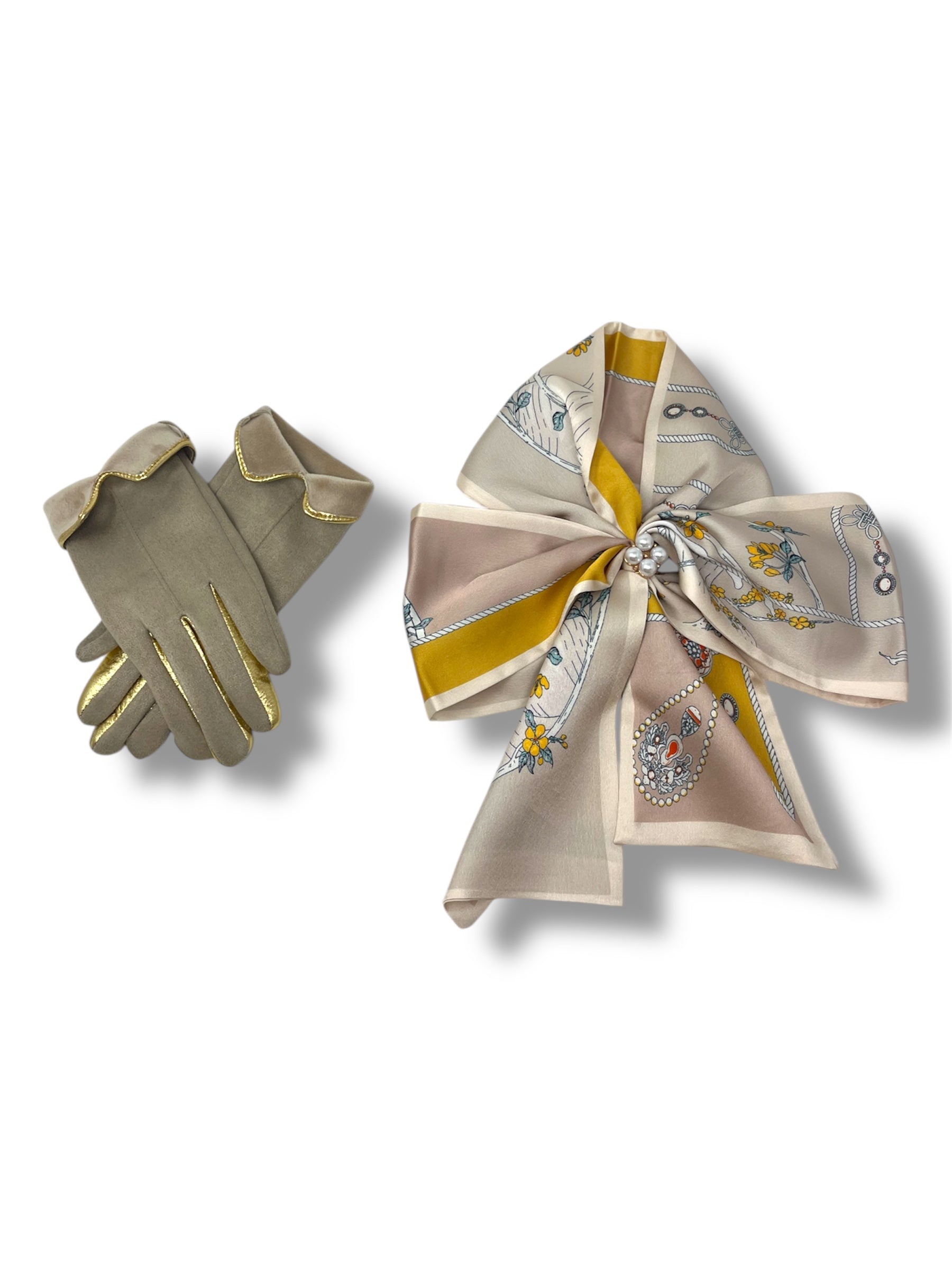 Unwrap the magic of the season with our curated gift box featuring a stylish printed silk scarf and a beautiful pair of beige gloves with a gold trim.
